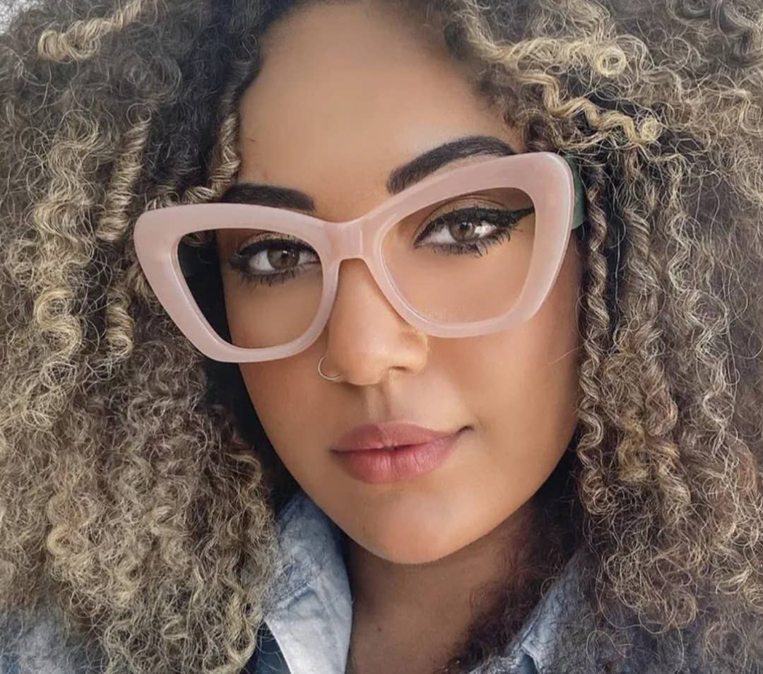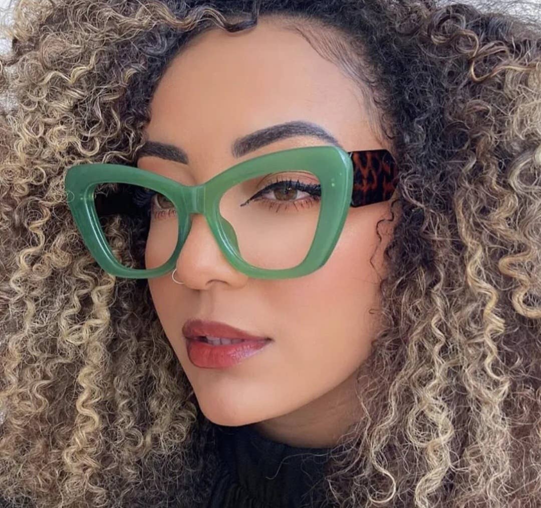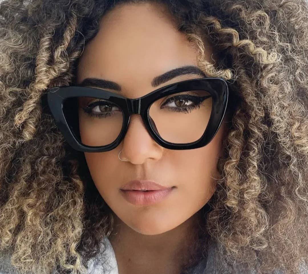 Get these trendy new designer frames today! Stylish, cat eye design with a clear lens.