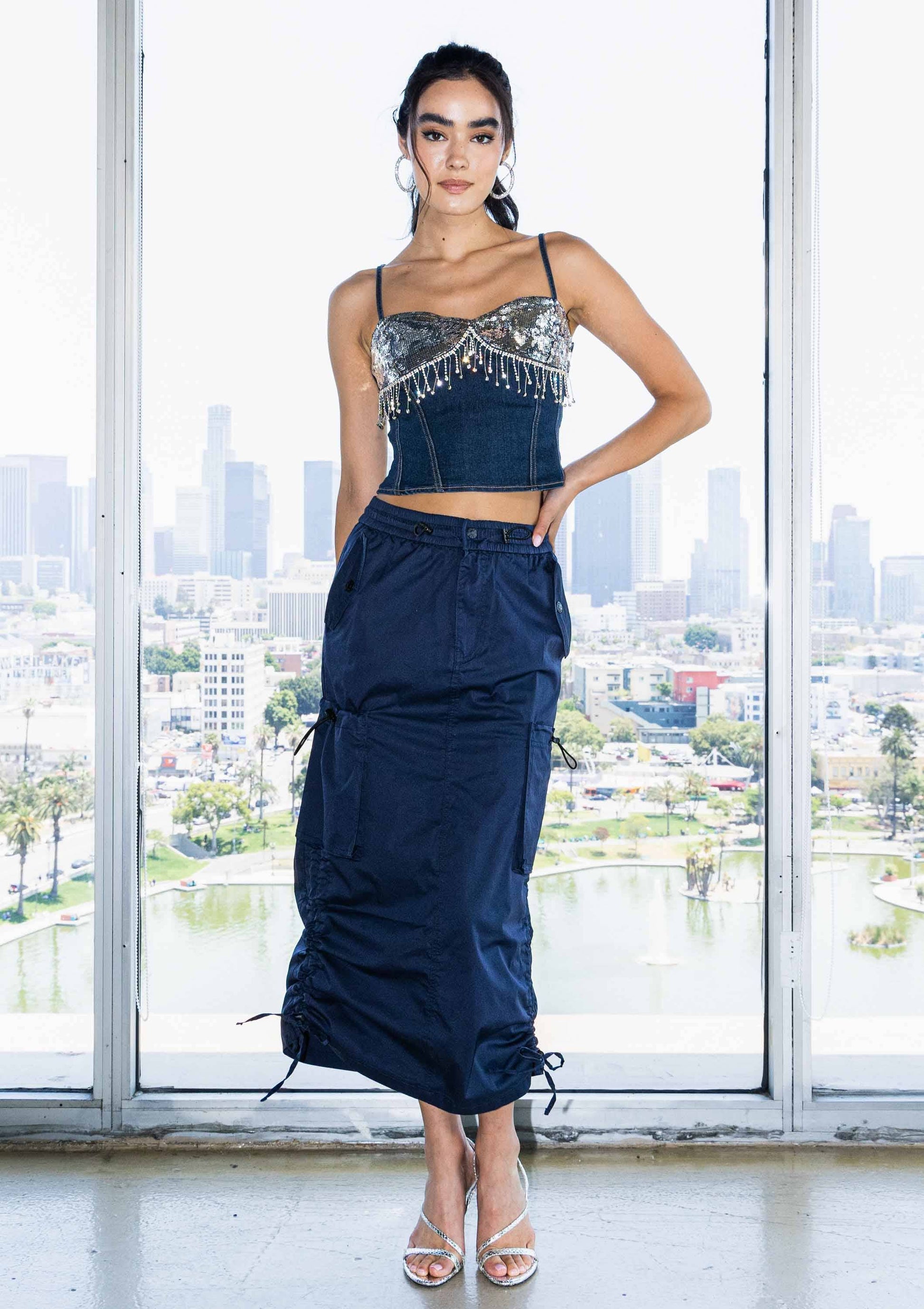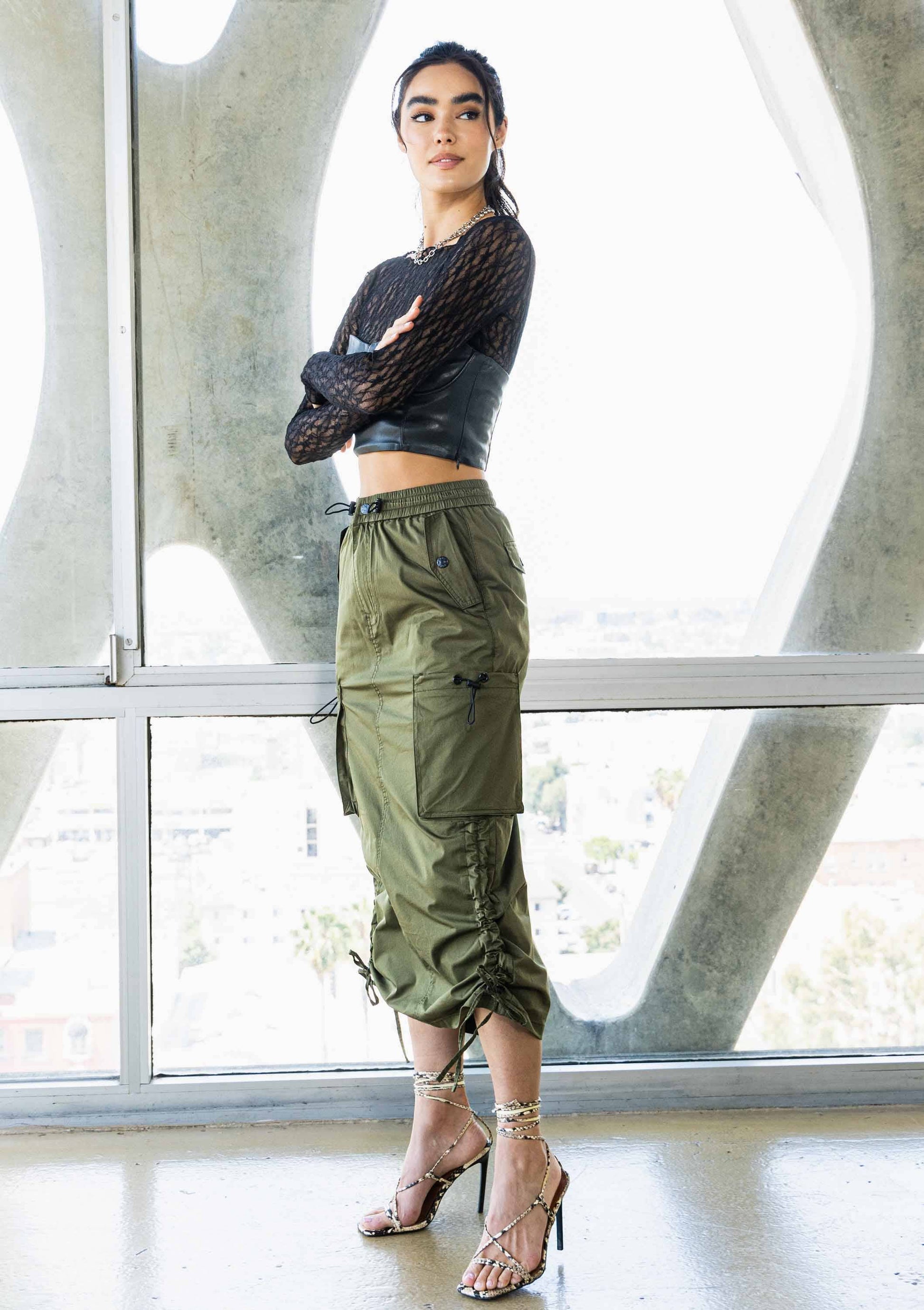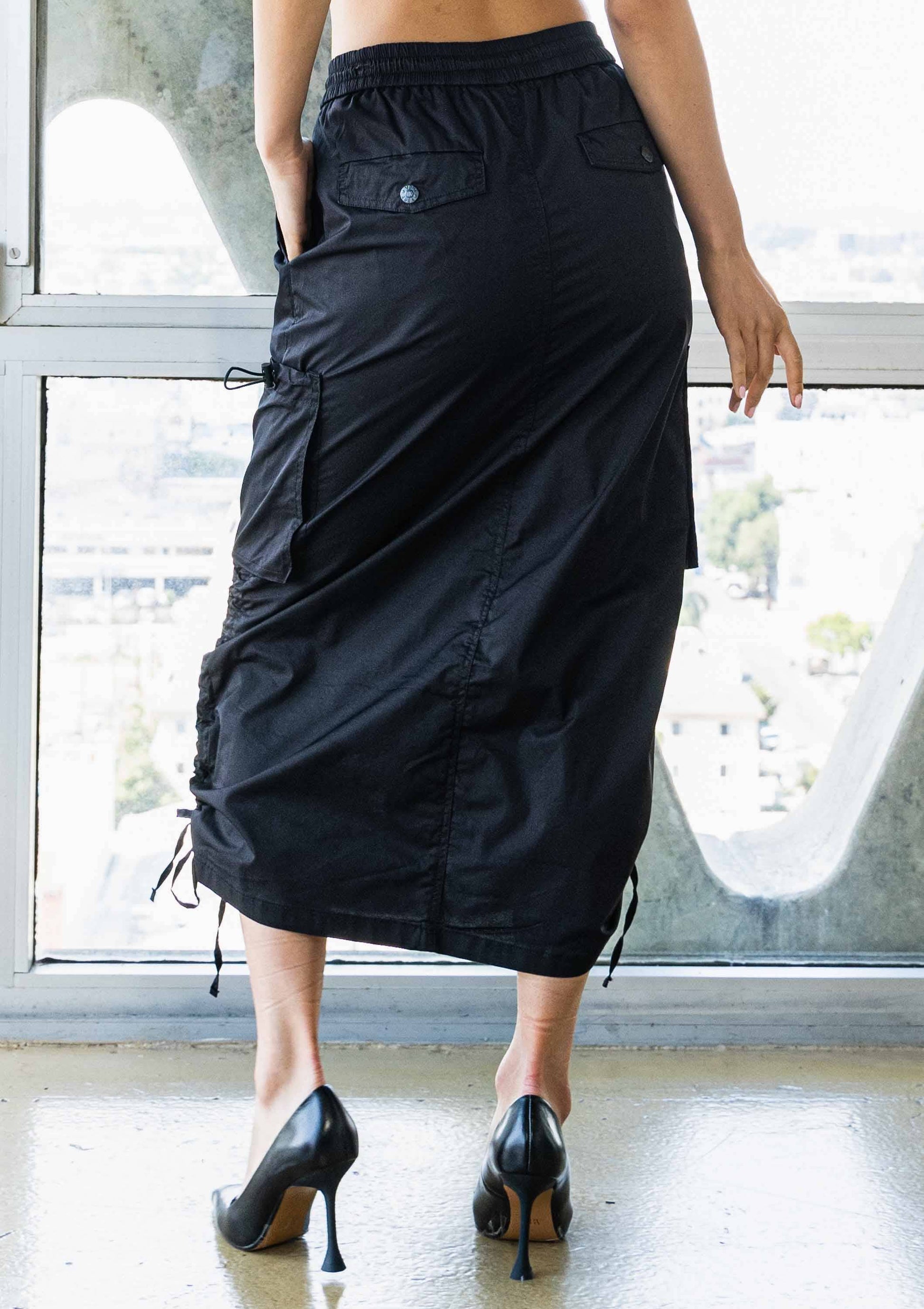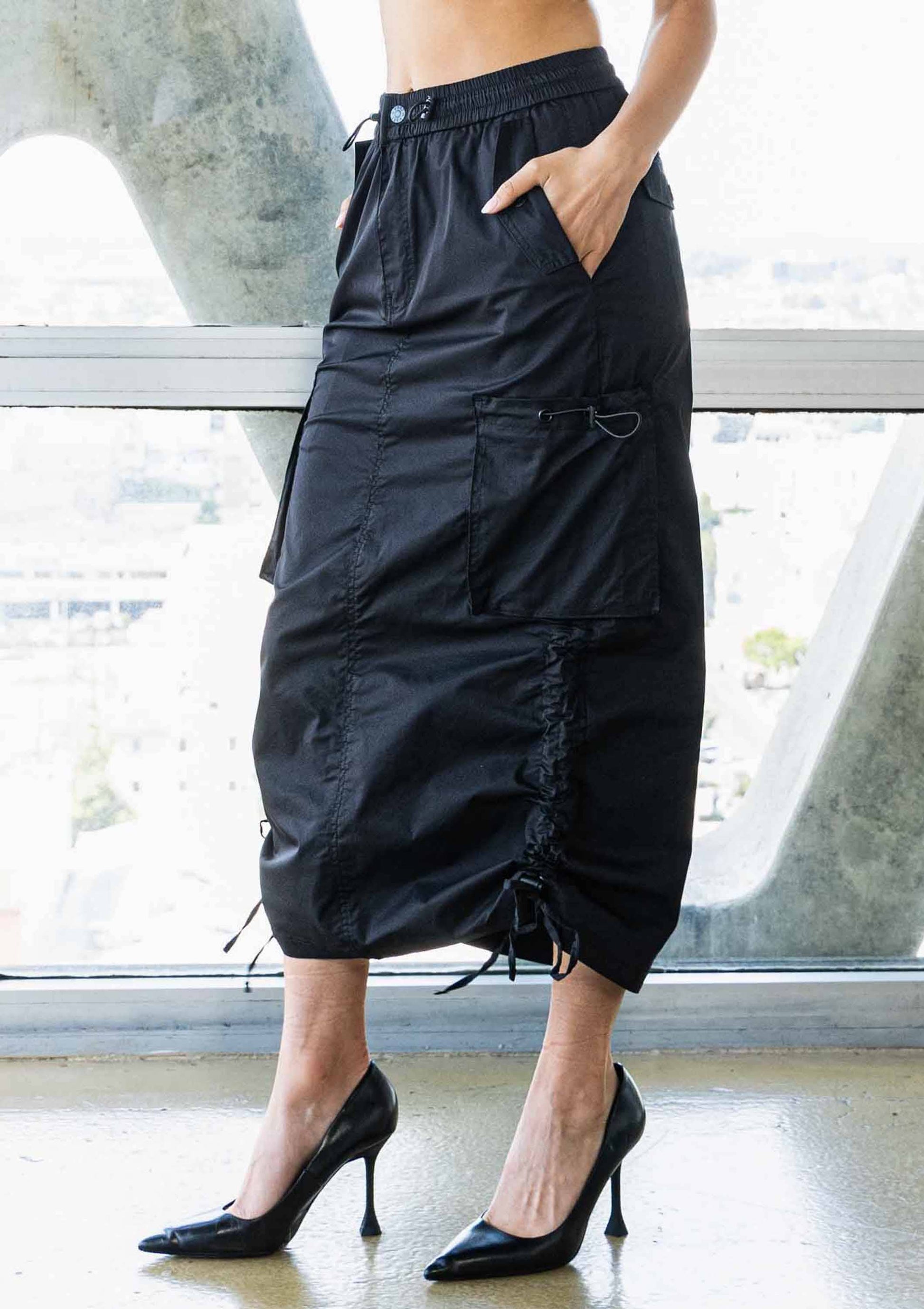 A cargo midi skirt featuring drawstring side flap, cargo pockets, front, back pockets, elastic waist band and zip-fly closure.
