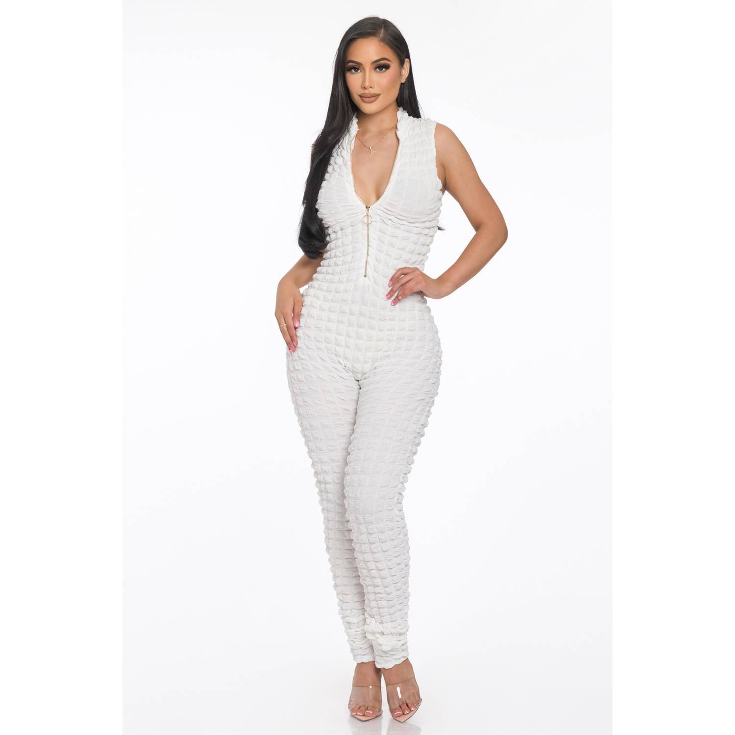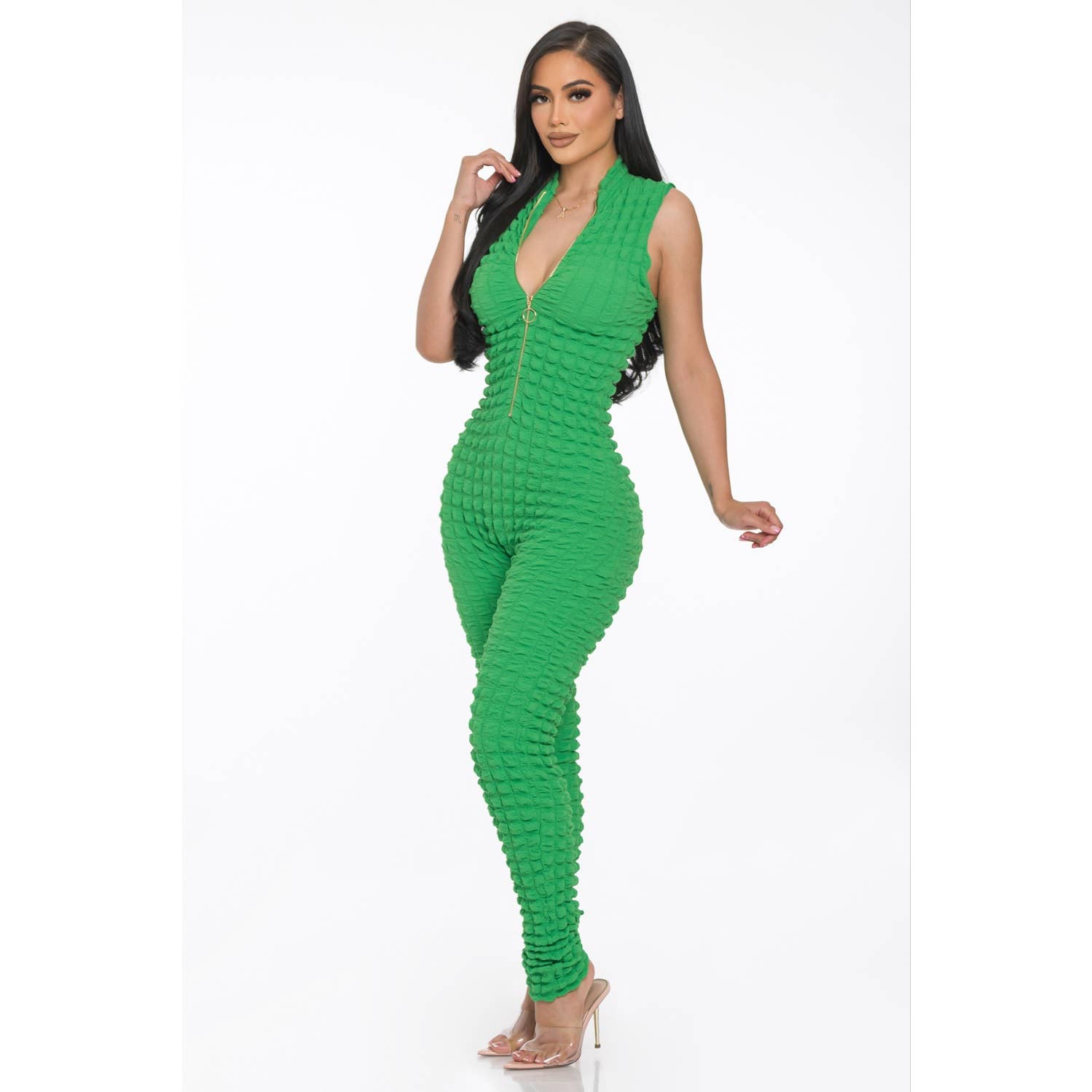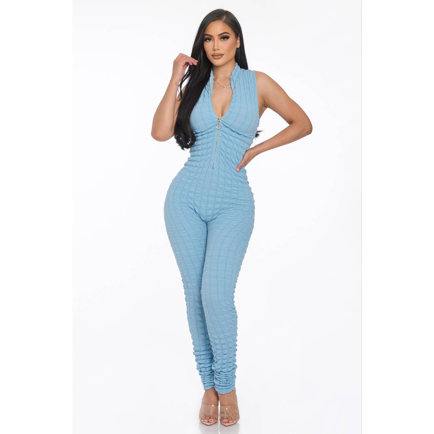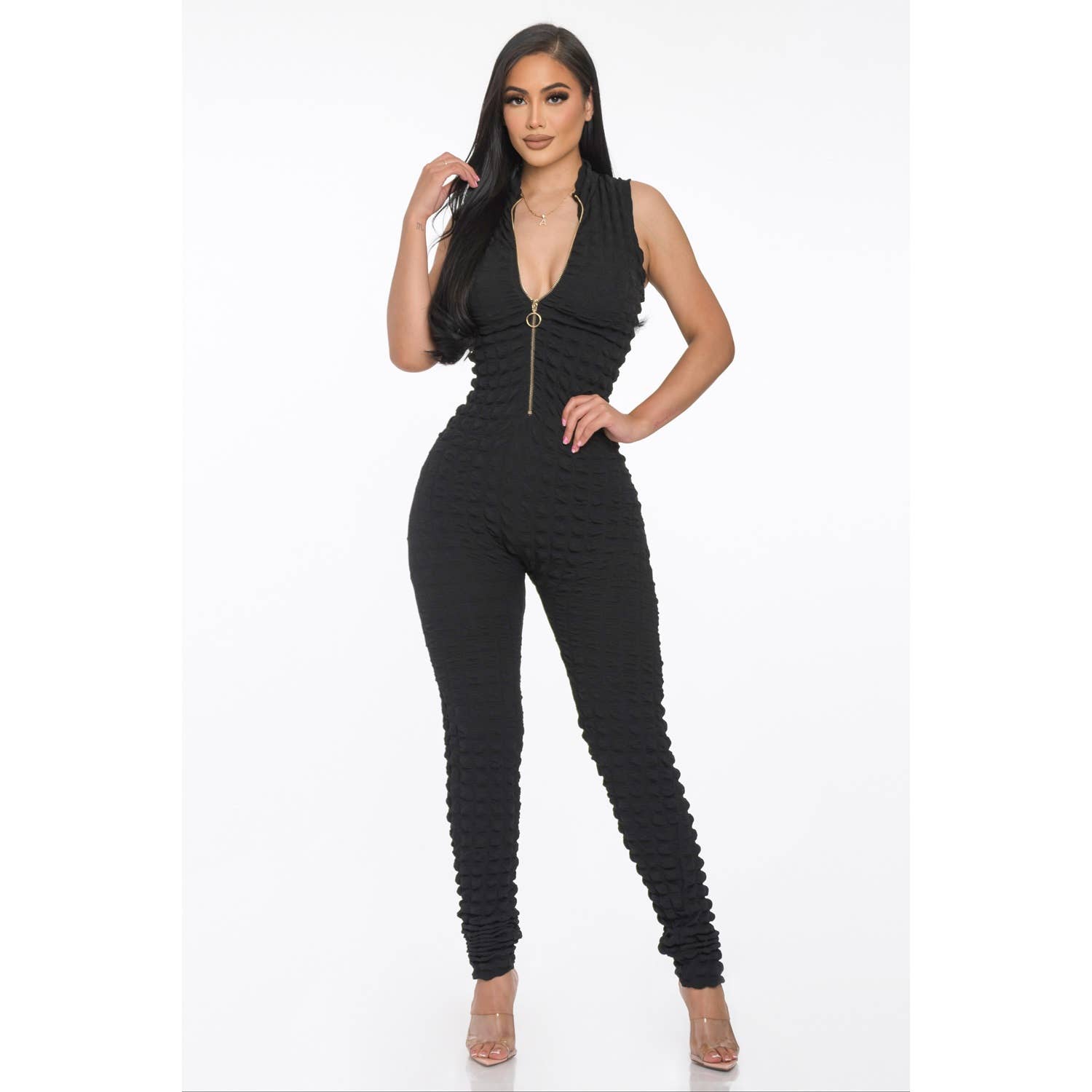 Popcorn textured solid colored o-ring half zip mock neck sleeveless Jumpsuit