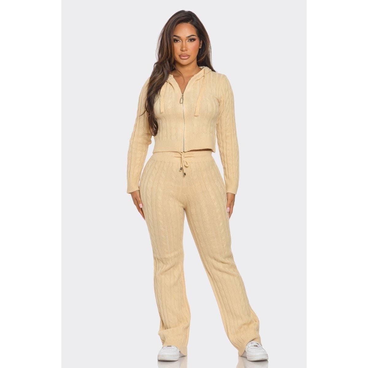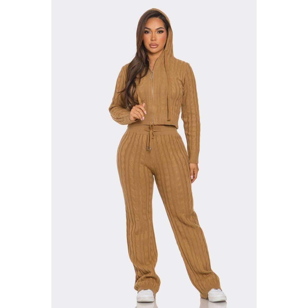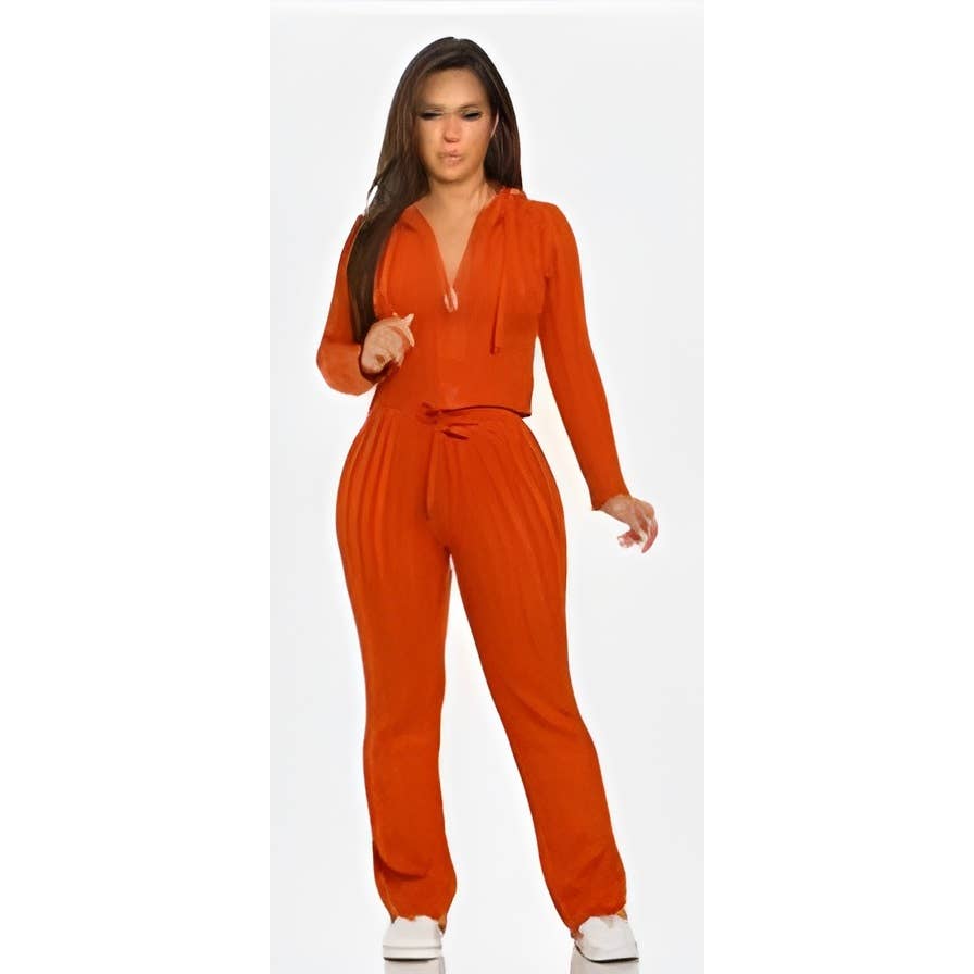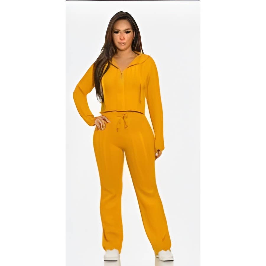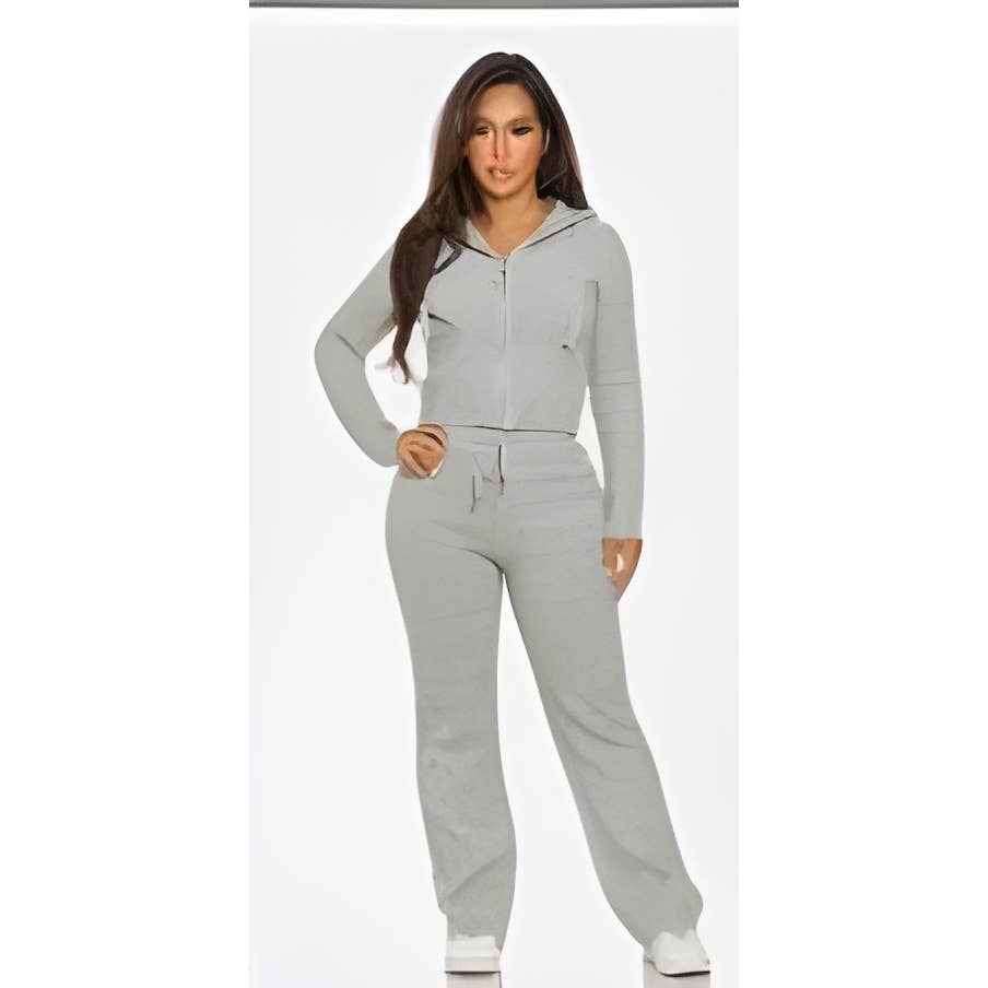 This set features a ribbed knit hoodie with a front zipper and matching flare bottoms. The hoodie includes long sleeves, a drawstring hood, and a fitted waist, providing a cozy yet stylish look. The flare bottoms have a drawstring waist for adjustability and comfort, with a wide-leg design that adds a trendy touch. Made from 100% acrylic, the set combines warmth and flexibility, making it ideal for casual wear while maintaining a fashionable silhouette.