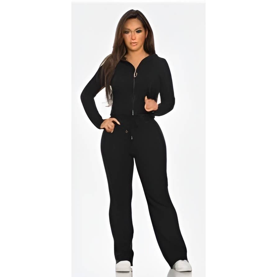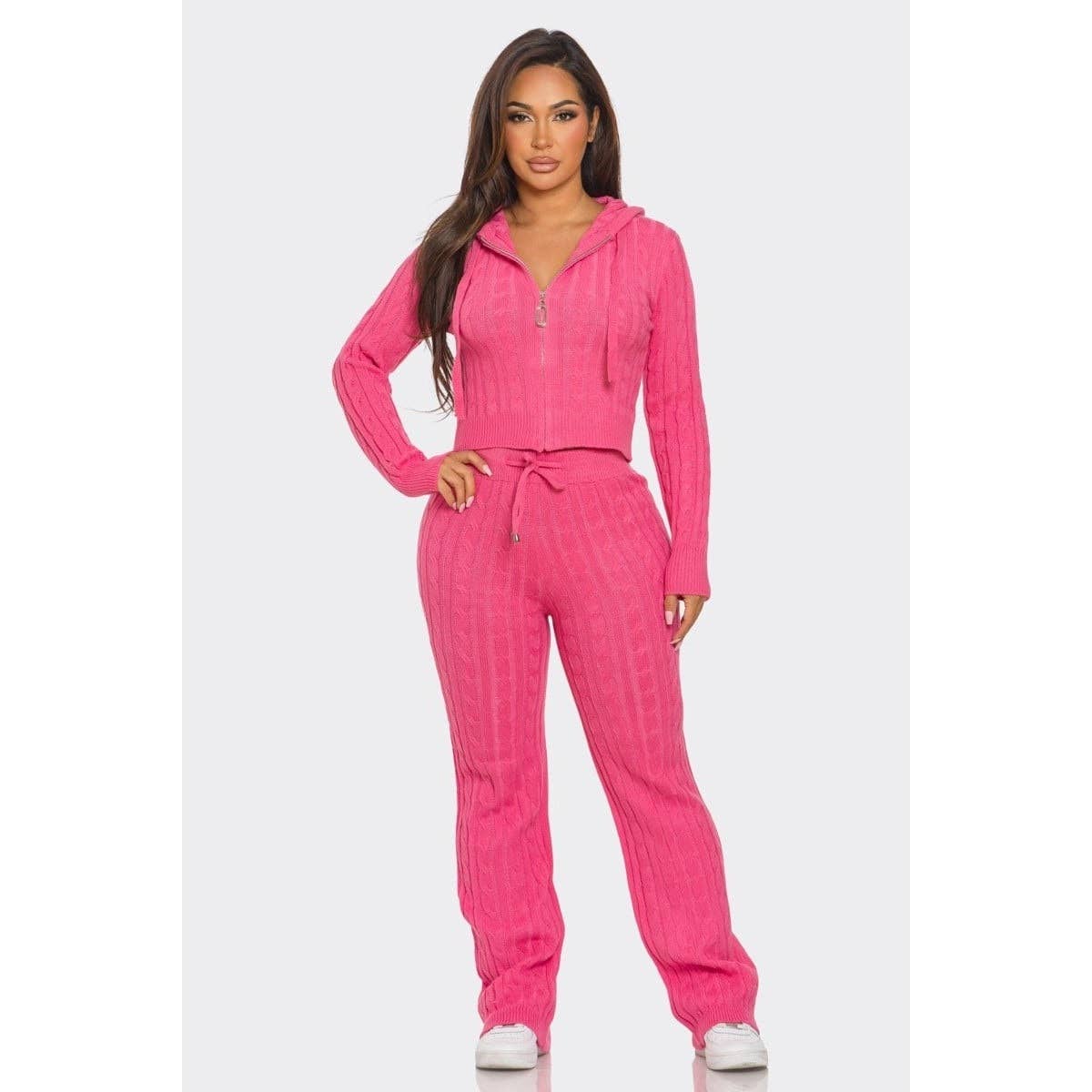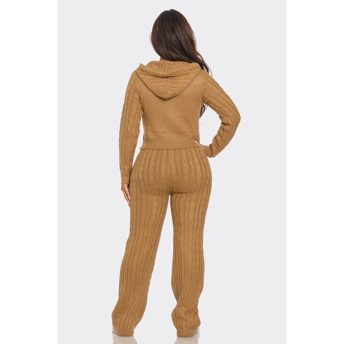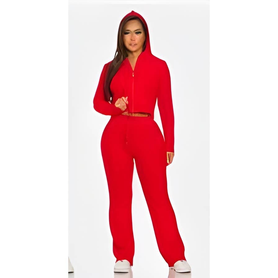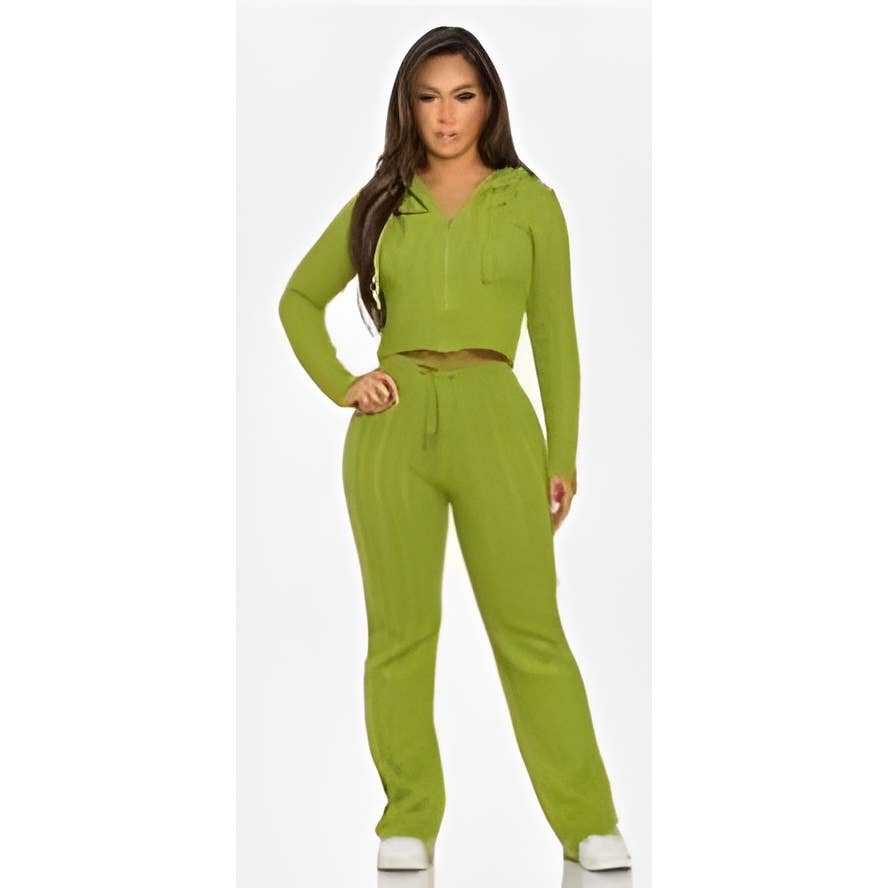 This set features a ribbed knit hoodie with a front zipper and matching flare bottoms. The hoodie includes long sleeves, a drawstring hood, and a fitted waist, providing a cozy yet stylish look. The flare bottoms have a drawstring waist for adjustability and comfort, with a wide-leg design that adds a trendy touch. Made from 100% acrylic, the set combines warmth and flexibility, making it ideal for casual wear while maintaining a fashionable silhouette.