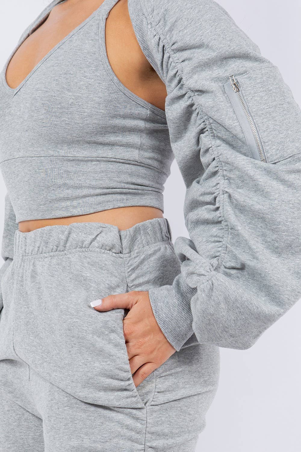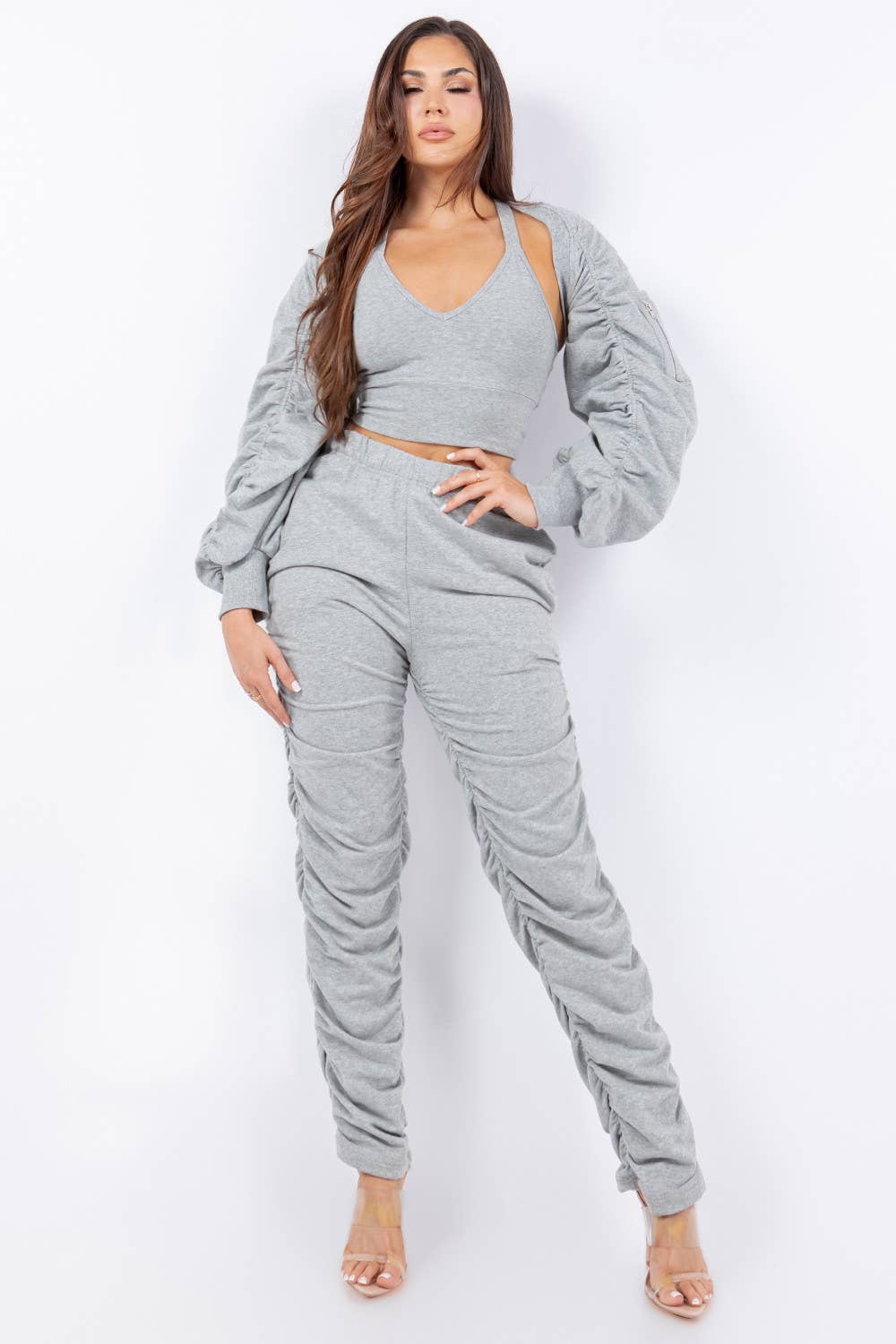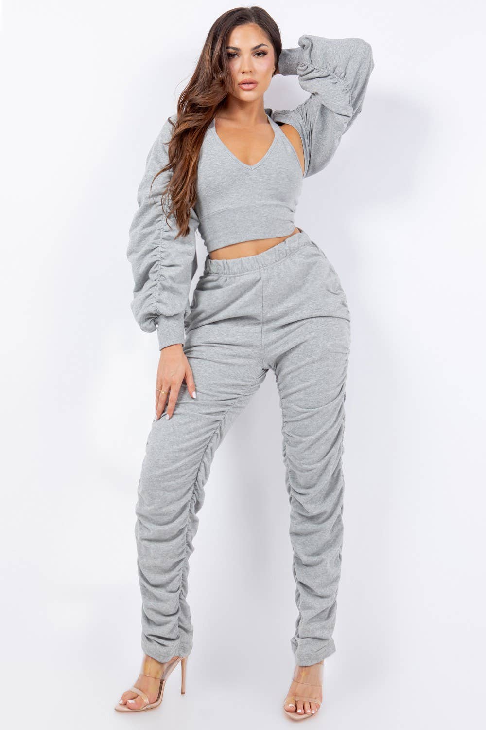FRENCH TERRY TANK TOP with RUCHED detail TOP and SWEAT PANT SET RUCHED STACKED STRETCH COMFY SPORTY EXERCISE REAL POCKET