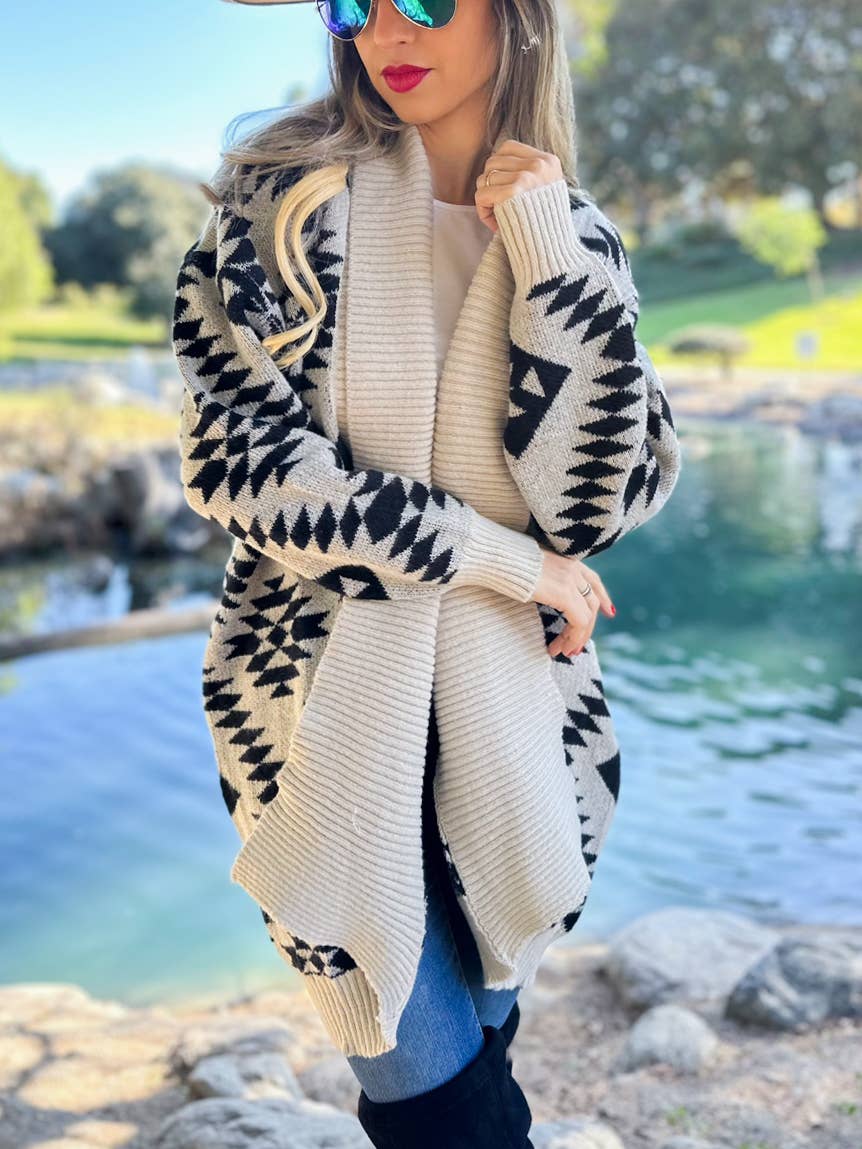 Refresh your collection with our Trendy Beige Aztec Printed Lightweight Cardigan. This eye-catching cardigan features a bold Aztec print that brings a modern twist to traditional patterns, perfect for making a stylish statement.