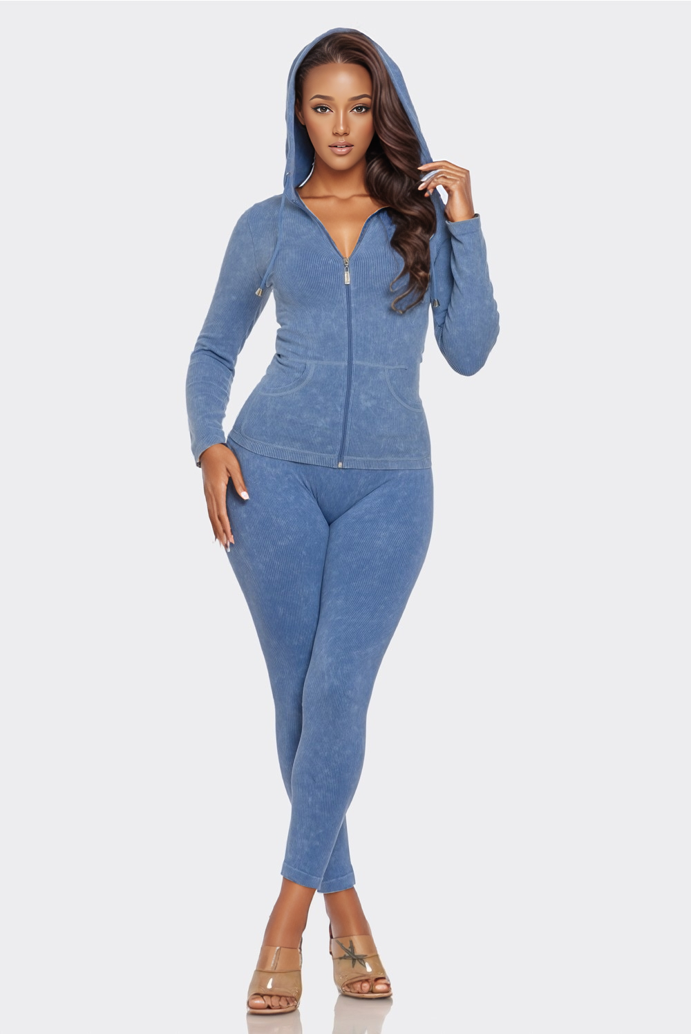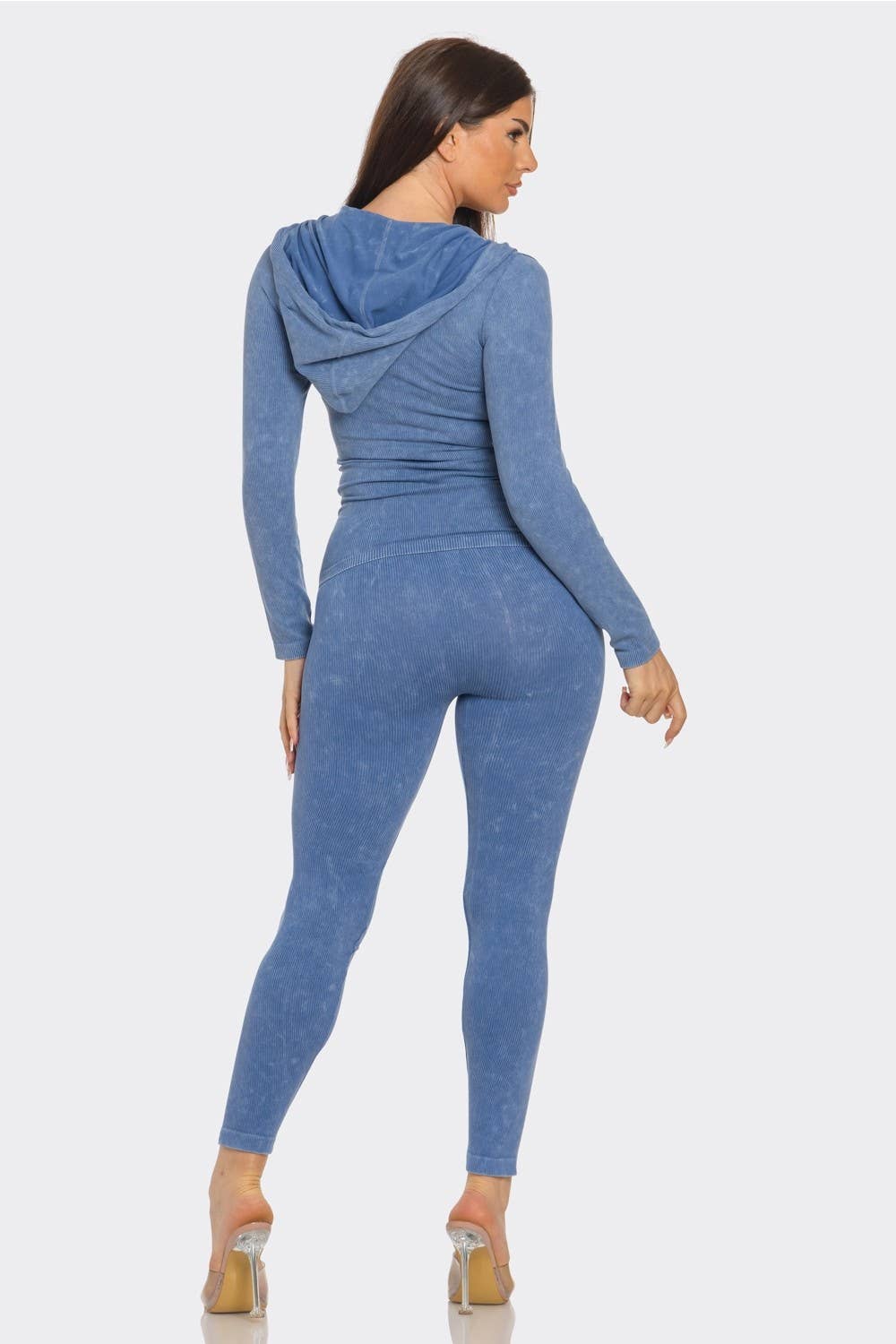 A fitted two-piece set made from washed seamless ribbed fabric, featuring a zip-up hoodie with front pockets and matching high-waisted leggings. Soft, stretchy, and comfortable for everyday wear.