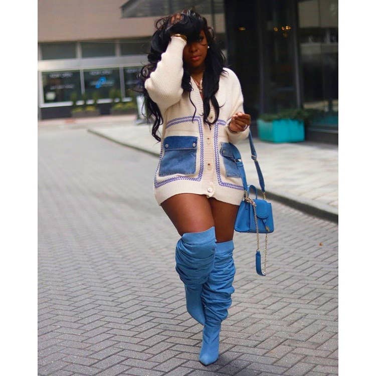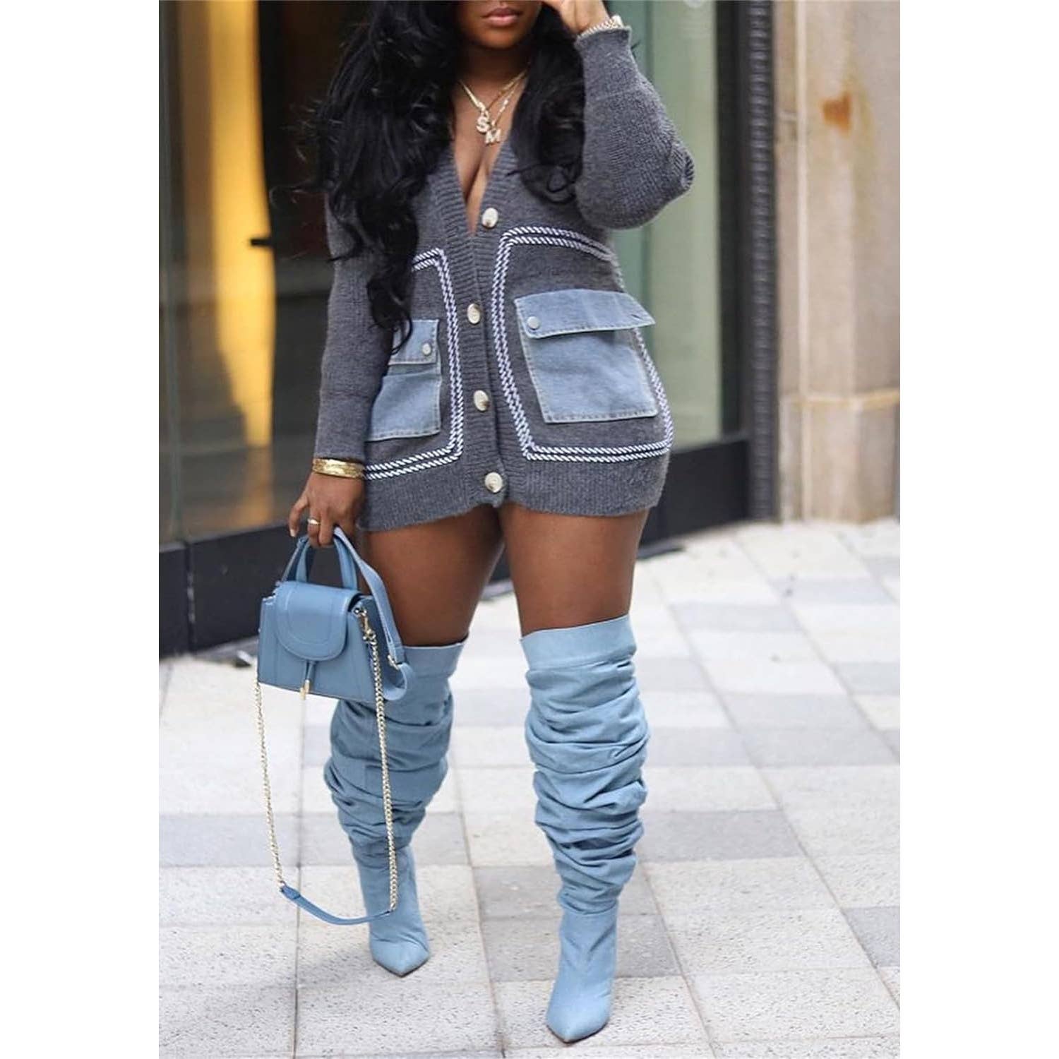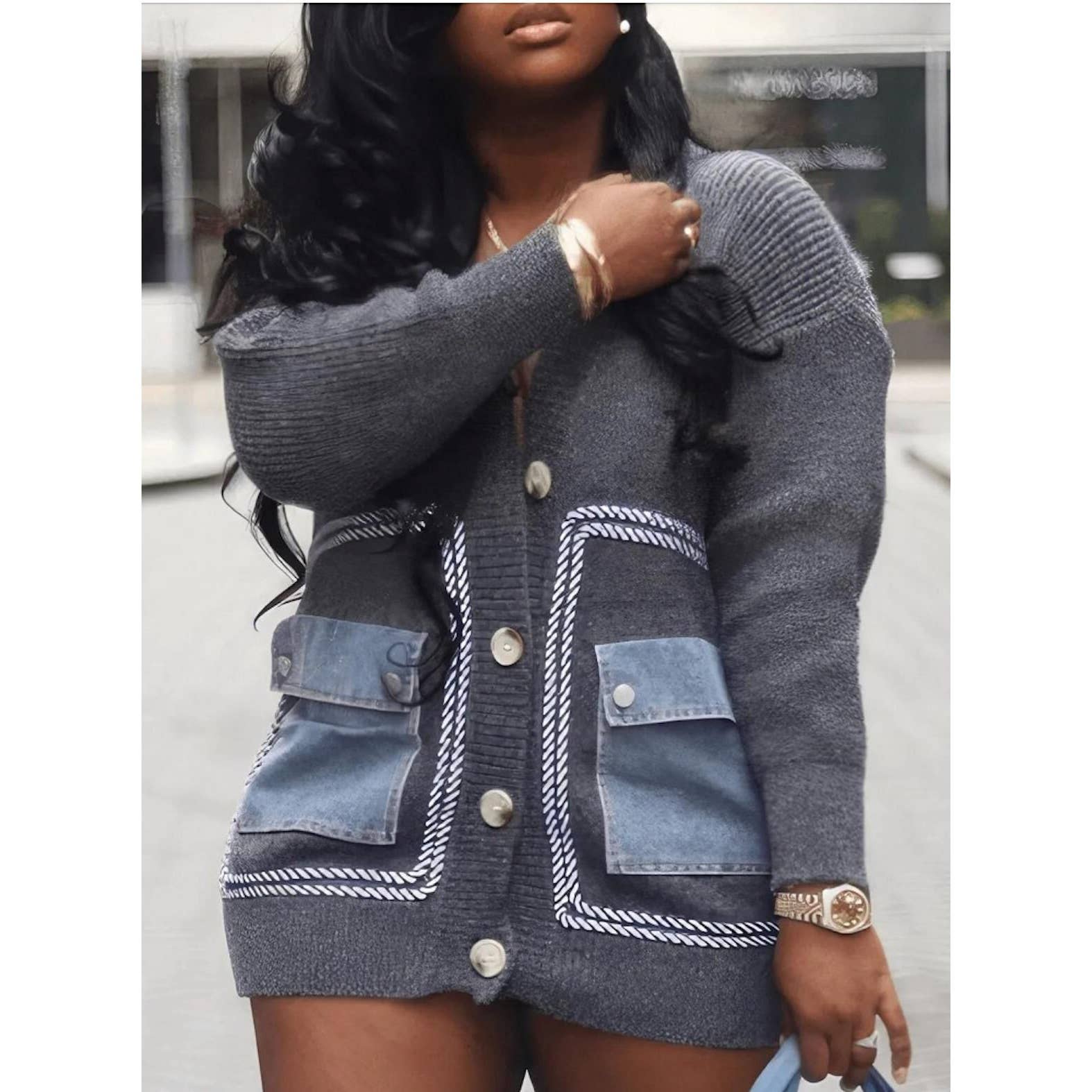 Women Cardigan Sweater Long Sleeve Denim Pockets Patchwork Button Down Casual Open Front Fall Winter