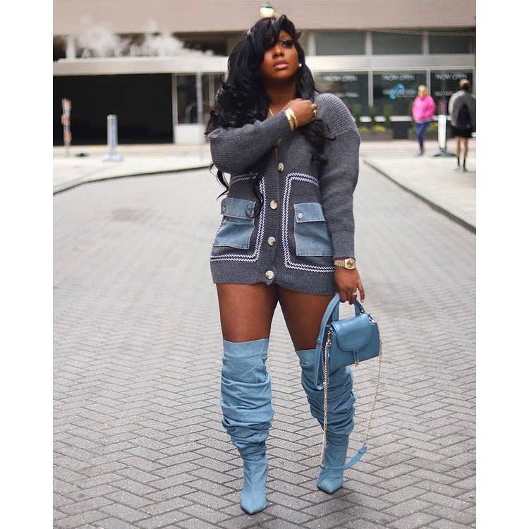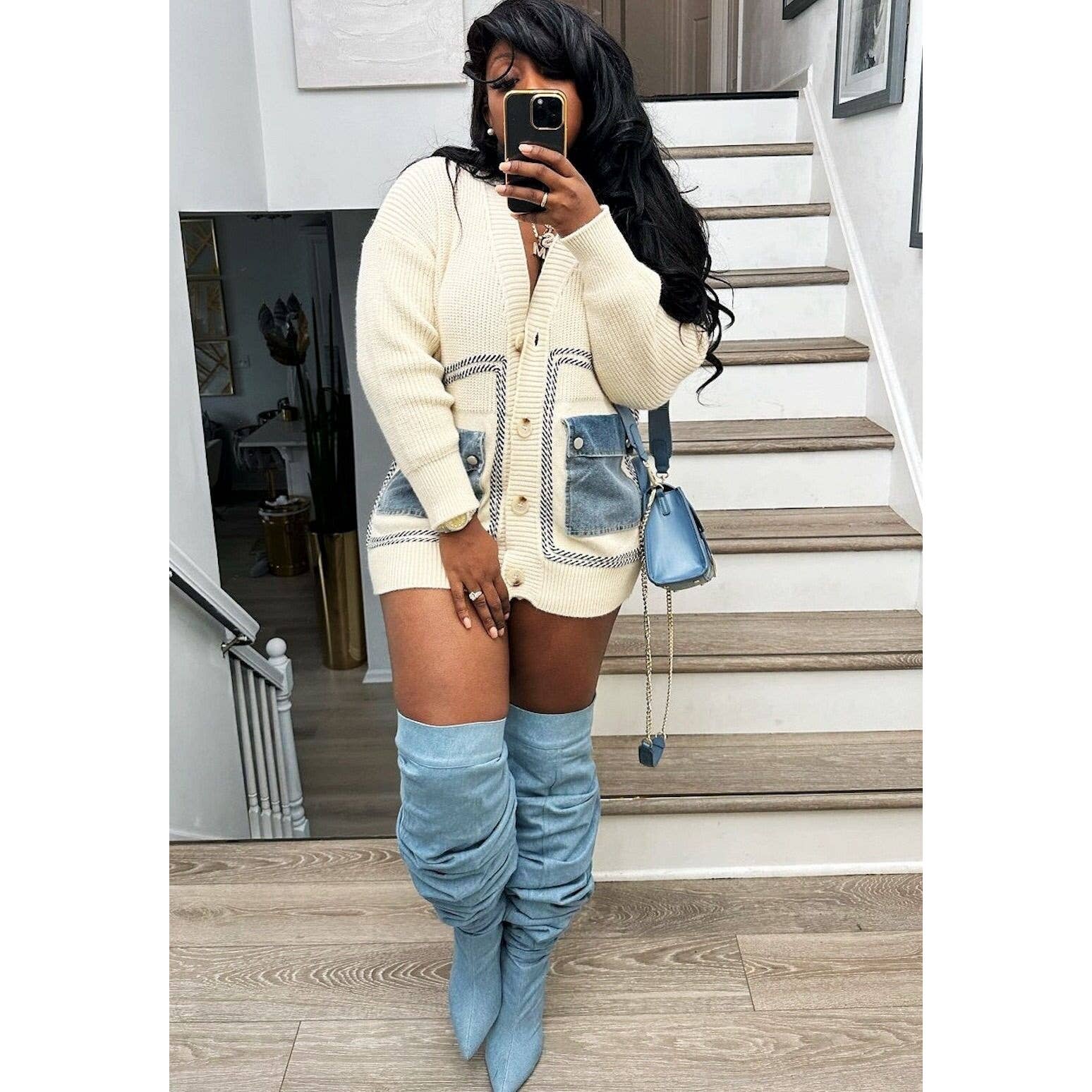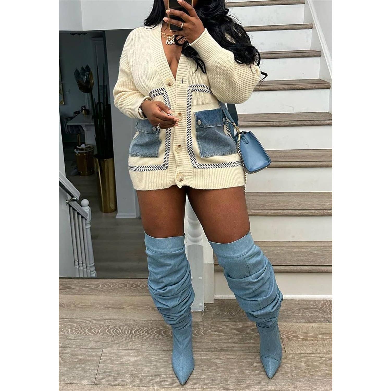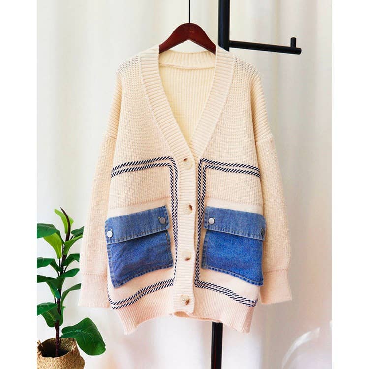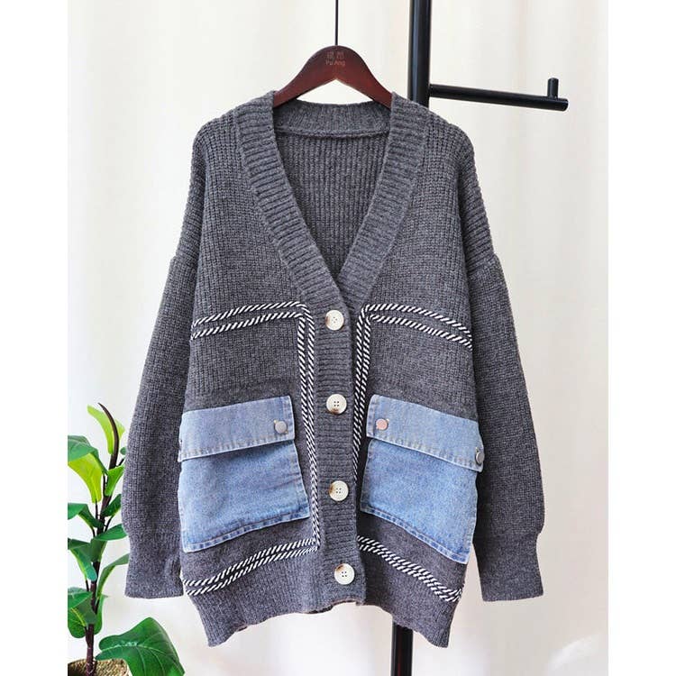 Women Cardigan Sweater Long Sleeve Denim Pockets